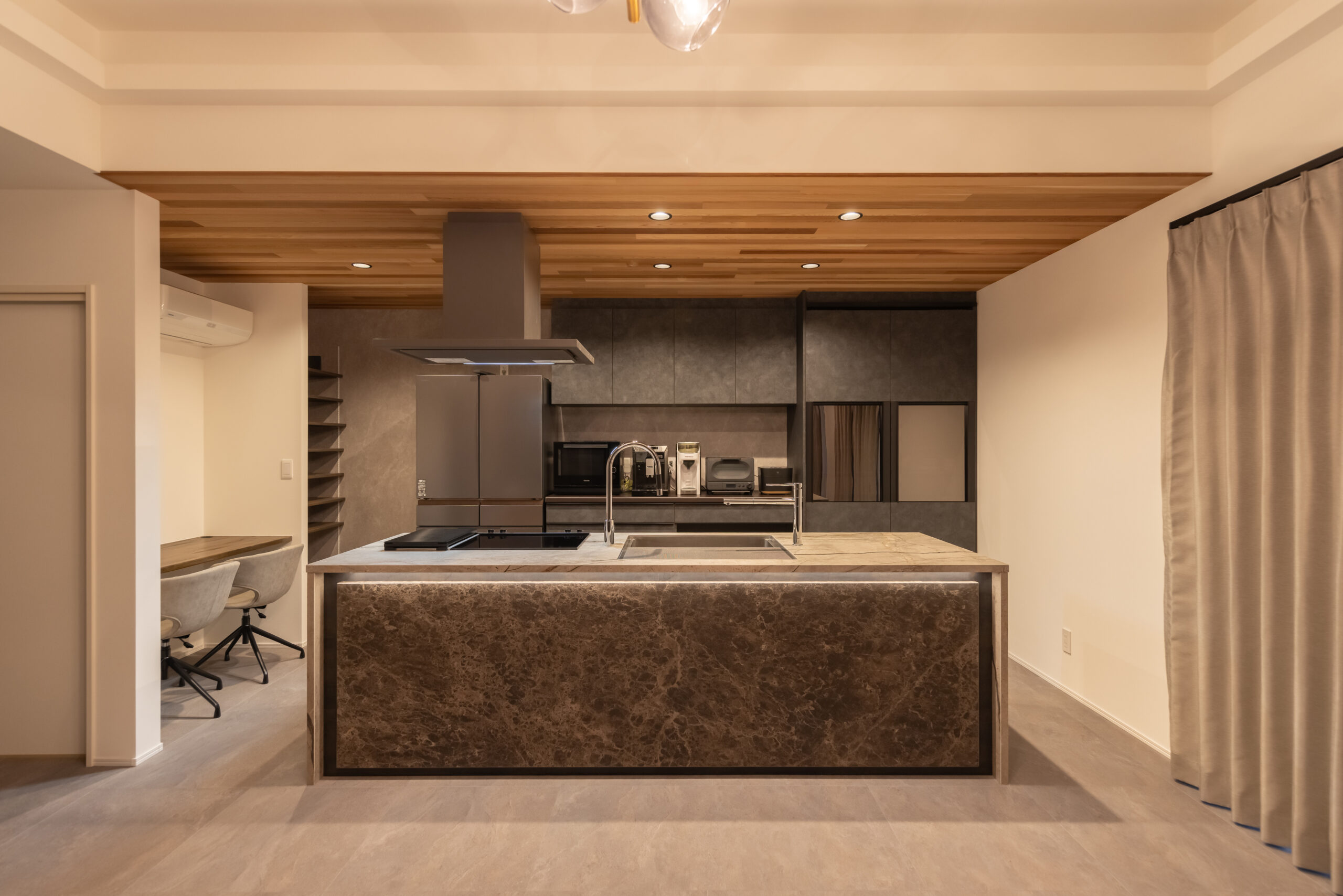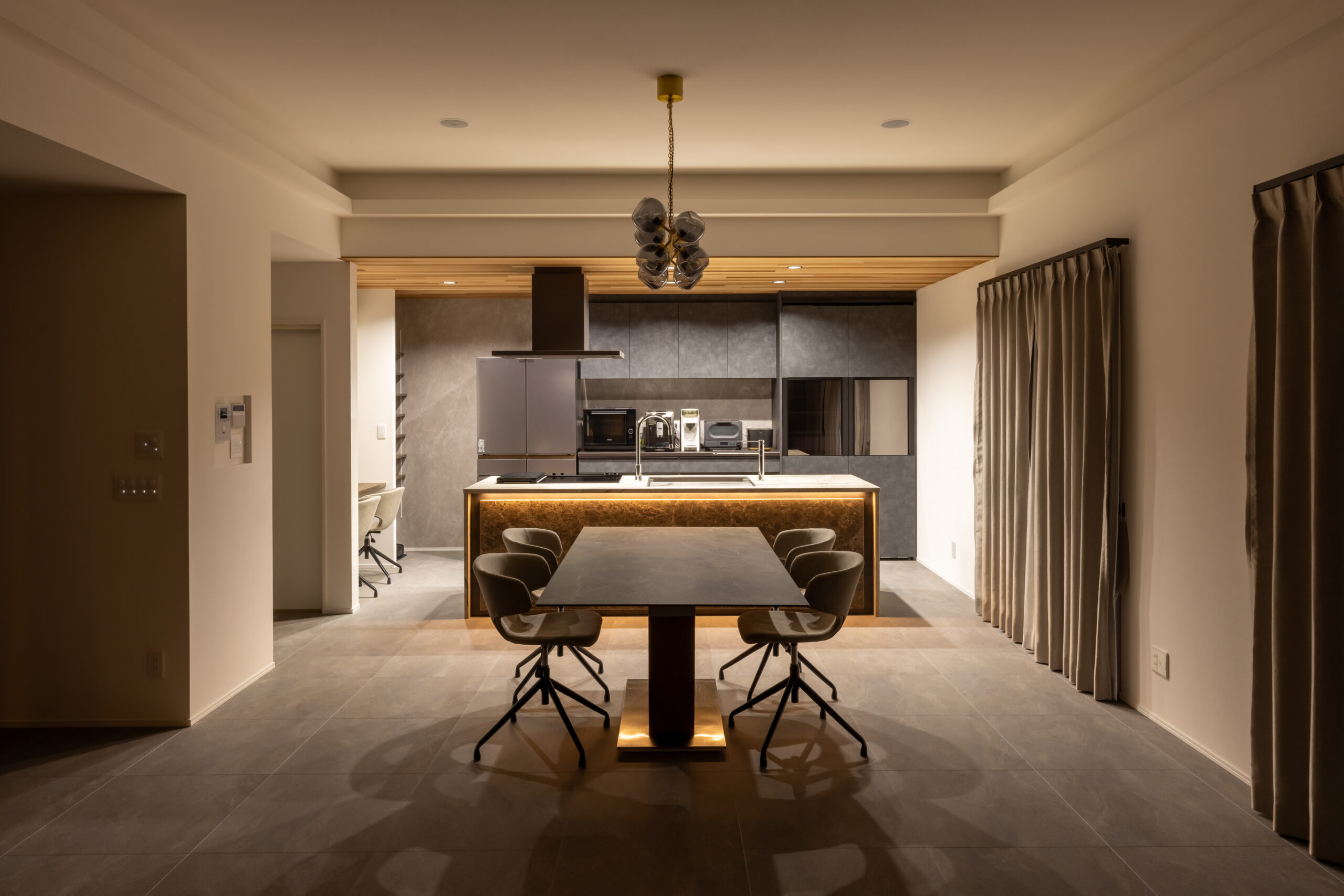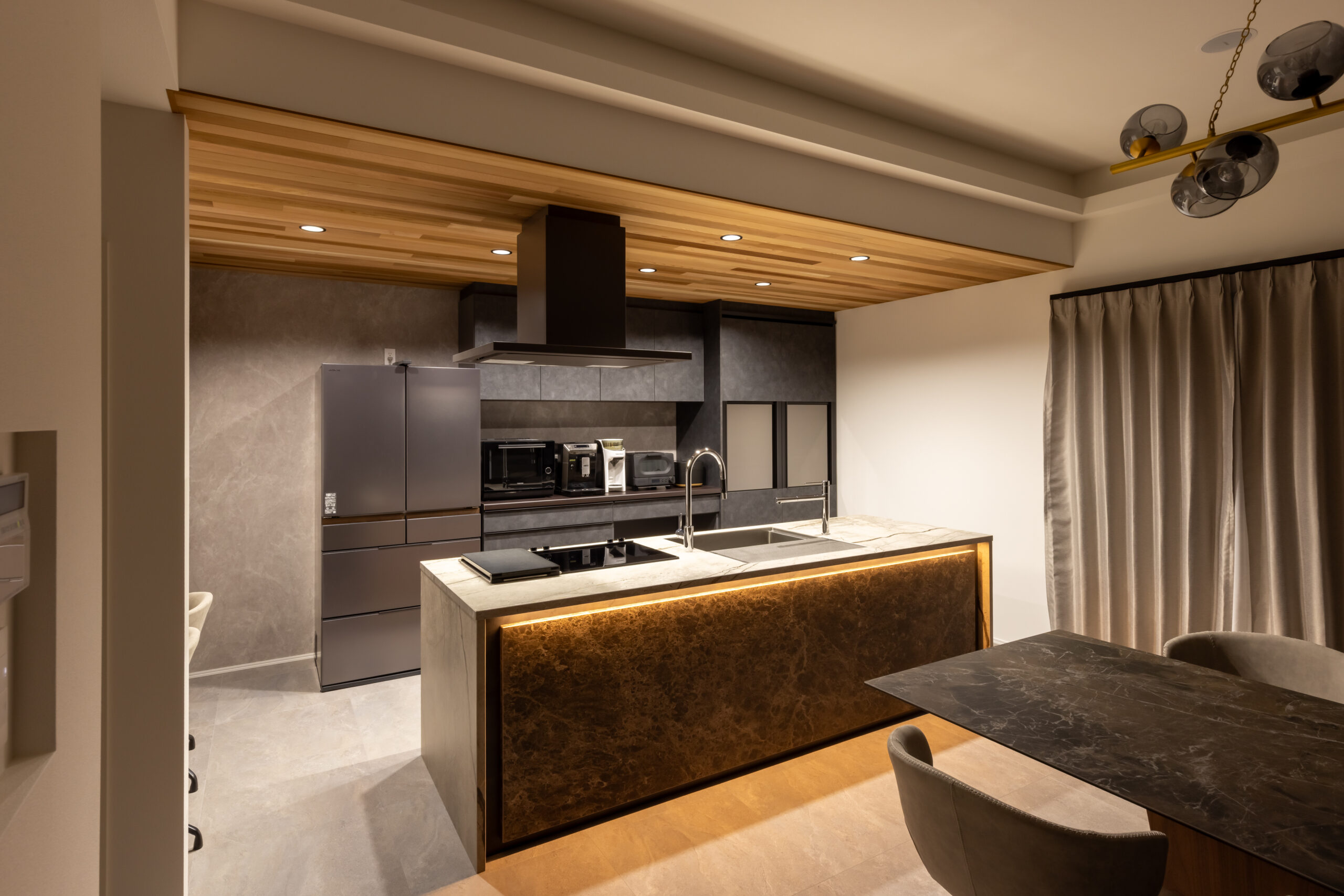 オーナー様とお打合せを始めたのは1年以上前。奥様のお腹には新しい命が。ご新居のお引渡しの日には誕生した新たな家族は自分の顔を見て笑顔を見せてくれました。何とも言えない幸せな気持ちになることが出来ました。非常にセンスの良いご夫婦の希望を叶えるべく自分も全力でご対応させて頂きました。素材の良さを生かしLDKの象徴的キッチンが製作できたと思います。